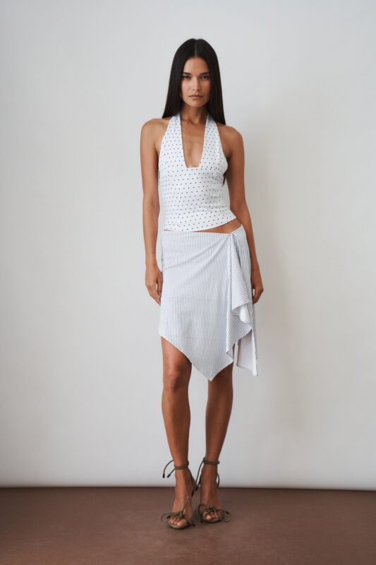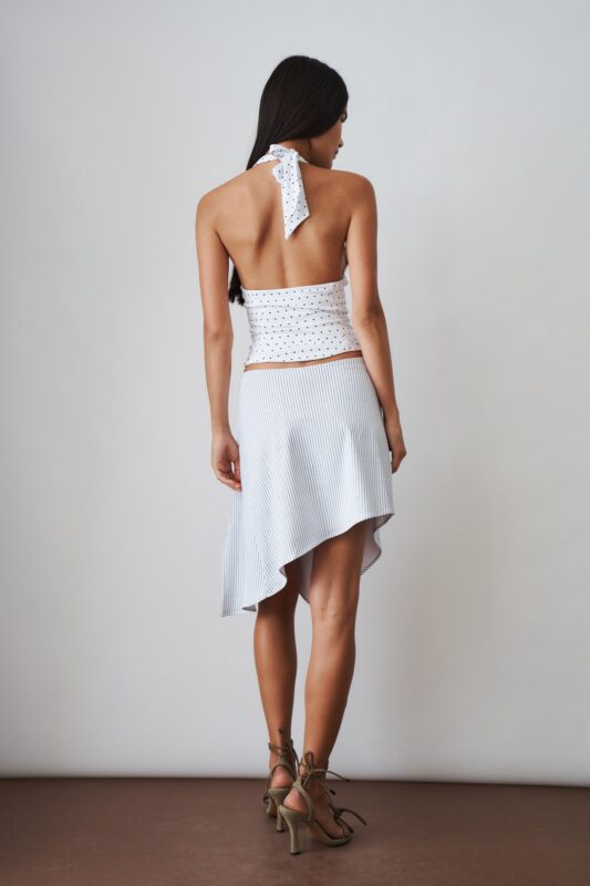 The Bobbi Skirt in Pinstripe is a refined yet playful summer essential. Designed with an asymmetric drape that moves effortlessly